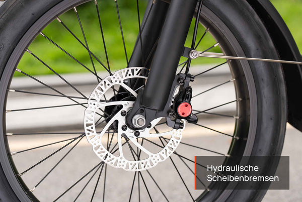 Die hydraulischen Scheibenbremsen (vorne und hinten) reagieren in Millisekunden. Sie haben sofortige Bremskraft zur Hand. Die Feststellbremse blockiert sofort beide Räder und sorgt so für sicheres Parken am Berg.